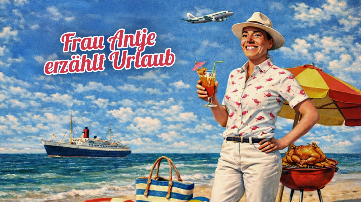 dann kann er was erzählen. Und wenn es gleich um die Urlaubs- und Reisegeschichte der Menschheit geht, dann gibt es es jede Menge zu erzählen. Und wo es soviel an Geschichte und Geschichte gibt, da ist natürlich Frau Antje nicht weit. Kommen Sie mit auf die vielleicht größte Reise Ihres Lebens: „Frau Antje erzählt Urlaub“- die Kulturgeschichte des Reisens. Erfahren Sie Urlaubsgewohnheiten verschiedenster Nationen. Und auch wenn es global zugeht - der Deutschen Reiselust ist ja eigentlich schon ein Abendprogramm für sich!