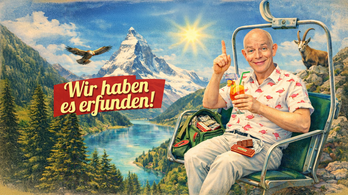 Die Schweiz gilt seit jeher als Ort der Erholung. Das sagt nicht nur der Rest der Welt, nein, das behaupten die Schweizer selbst. Wer hier den Alltag hinter sich lässt, Berge erklimmt, durch Wälder wandert oder am See den Sonnenunter- gang betrachtet, kommt unweigerlich ins Grübeln. Und genau dort, zwischen Aussichts- punkt und Liegestuhl, passiert es: Ein Gedanke verrutscht, ein Geistesblitz schlägt ein, eine Idee beschließt, zu bleiben. Dieser Abend widmet sich solchen Momenten. Er erzählt von Menschen, von Einfällen, die zunächst absurd klingen, dann irritieren und schließlich die Welt erobern. Skurril, erstaunlich, manchmal vollkommen unnötig und doch nicht mehr wegzudenken.